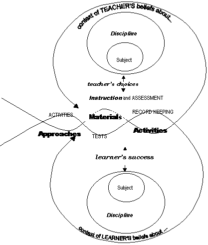 Teacher operations in the classroom are also influenced by the construct the teacher holds about a particular discipline and what is important to be learned from that discipline. The teacher also has understandings about how people learn this discipline and relationship of the subject within it and will therefore select learning materials which suit how they perceive students learn in that discipline. The teacher will assess the aspects of the subject they regard to be fundamental, thus providing cues to students about what is valued. The teacher's processes have in turn been shaped by the student's successes and responses within the learning environment she has created. This is shown in Figure 1. The figure is not intended to be linear but rather represent influences which filter back and forward in classroom interactions continually shaping the discourse.