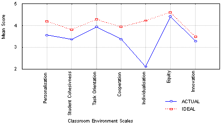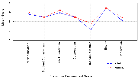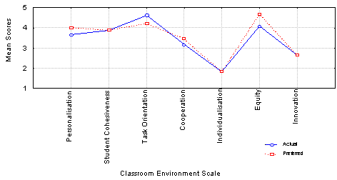 Younger students also perceived their classes to be less equitable than did the mature students and the difference in the actual perceptions can be gauged from the mean scores which are 4.51 for the mature students and 3.83 for the younger students. The findings here contrast with the findings of Fraser, Treagust, Williamson, and Tobin (1987) in which the least favoured classroom environment were those where adults were integrated with adolescents. However, the findings by Fraser, Treagust, Williamson, and Tobin (1987) were replicated in this study with respect to the low mean scores by mature students in the Individualisation and Personalisation scales. When the preferred environments were compared, younger students had a greater preference for changes in the four scales that were observed to have statistically significant differences in the mean values. These four scales were namely Personalisation, Student Cohes iveness, Cooperation and Equity.